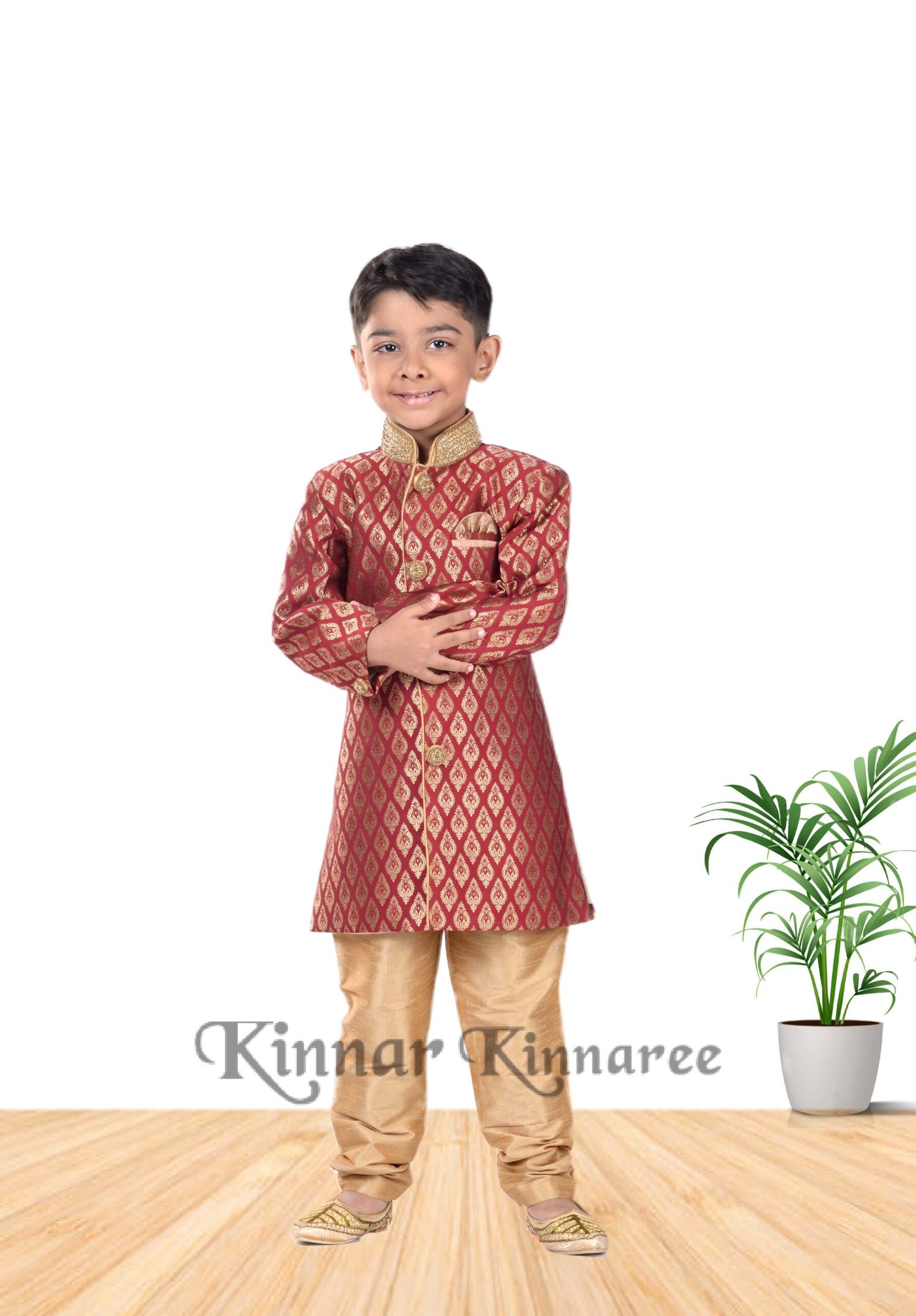 Fancy Work On Collar, Banaras Silk Sherwani Set For Kids